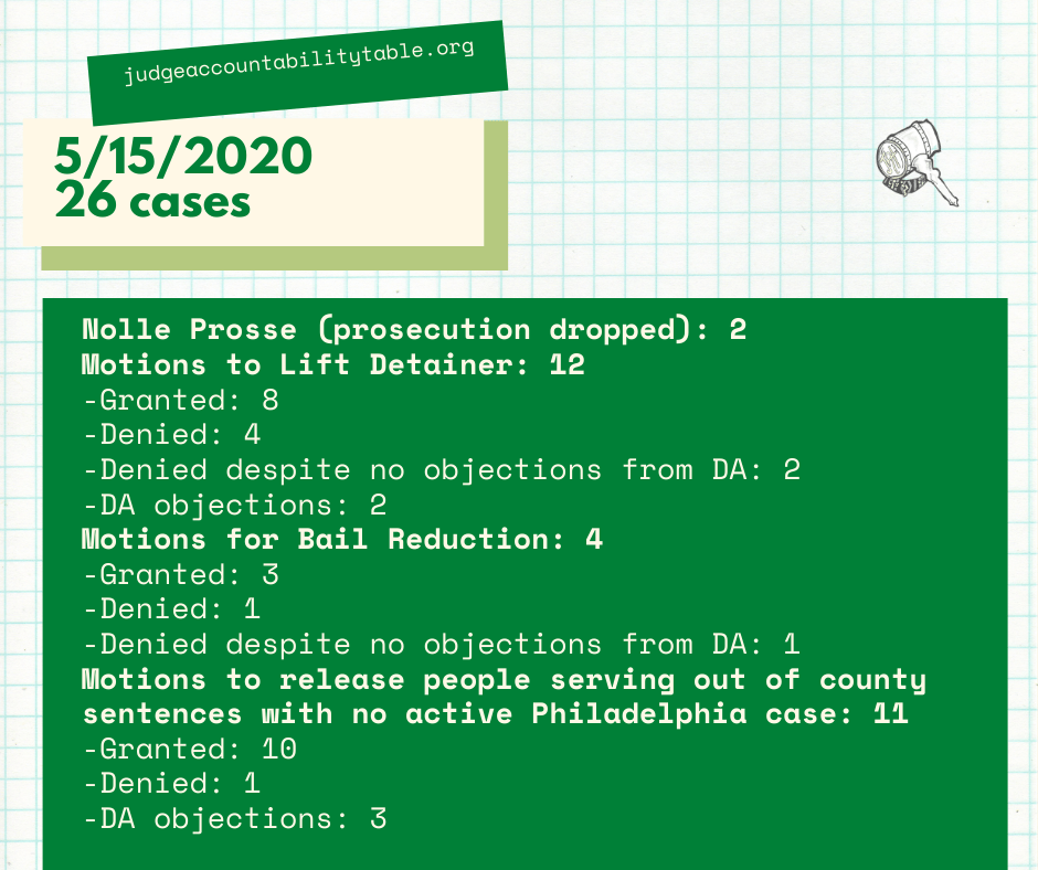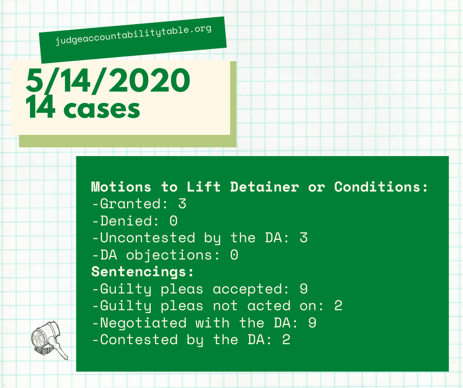 Courtwatching Stats for May 14 & 15 Posted byjudgeaccountabilitytableMay 21, 2020Posted inUncategorized Here’s a rundown of what happened last week: Share this: Click to share on X (Opens in new window) X Click to share on Facebook (Opens in new window) Facebook Like Loading... Related
